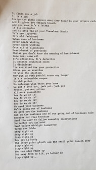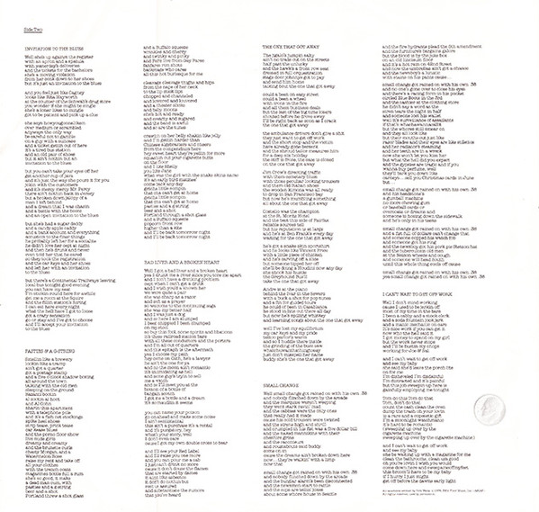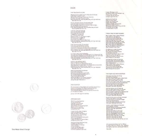 Includes printed inner sleeve with lyrics. For the song "Step Right Up" the lyrics are not provided. There is a mail-order address the buyer is instructed to send a number of things to.