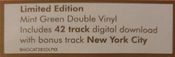 Hype sticker on outer shrinkwrap reads "Limited Edition, Mint Green Double Vinyl, Includes 42 track digital download with bonus track New York City, BMGCAT385DLPXX".