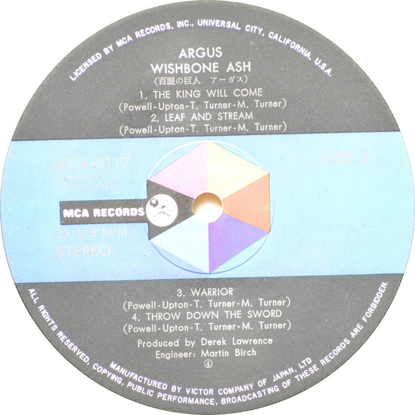 It would appear that this is an earlier Japanese pressing to Wishbone Ash - Argus as it has Victor Company Of Japan, Ltd. labels rather than Victor Musical Industries, Inc. labels. The transition from Victor Company Of Japan, Ltd. to Victor Musical Industries, Inc. took place on 21 May 1972 and this pressing used the old Victor Company Of Japan, Ltd. labels, even though it was obviously manufactured by Victor Musical Industries, Inc. as on the back cover it states....