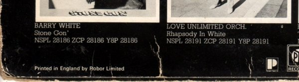Rear bottom left sleeve: Printed in England by Robor Limited