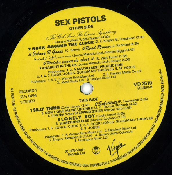 - Written-By – Matlock* (tracks: A1, A5, A7, C1, D2), Rotten* (tracks: A1, A5, A7, C1 to C3, D2), Cook* (tracks: A1, A5, A7, B1, B5, C1 to C4, D2, D3), Biggs* (tracks: A5, C4), Vicious* (tracks: C2, C3), Jones* (tracks: A1, A5, A7, B1, B5, C1 to C4, D2, D3)