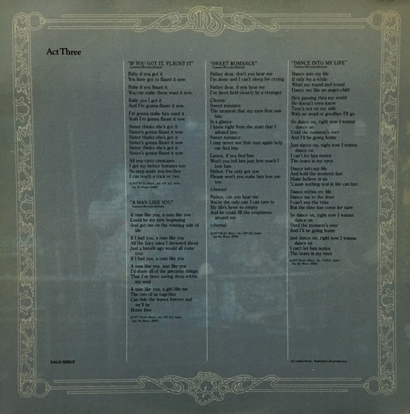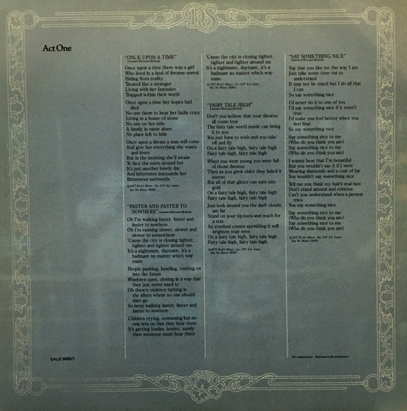 Sturdy cardboard gatefold sleeve issued with two double-sided 12" x 12" lyric inserts printed on heavy stock paper. Most other editions of this album had the lyrics printed on the inner sleeves with the same color and font.