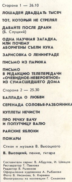 - Vocals, Guitar, Music By, Lyrics By – Владимир Высоцкий