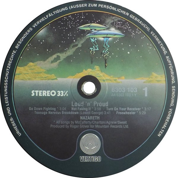 Song writing credited to "Nazareth" on the back sleeve but to individual band members on the labels. Thus, credits listed differently in the Track list and the Credits section.