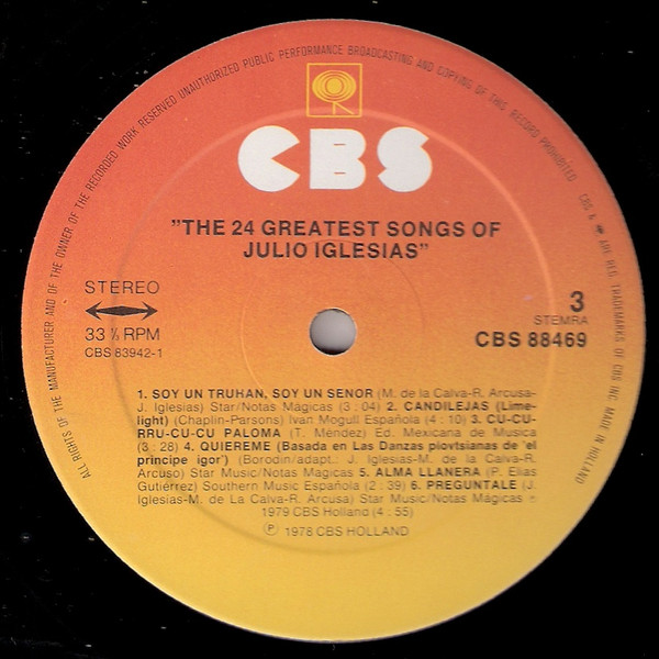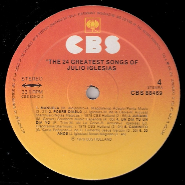 Release title printed on spine and disc labels as "The 24 Greatest Songs Of Julio Iglesias"