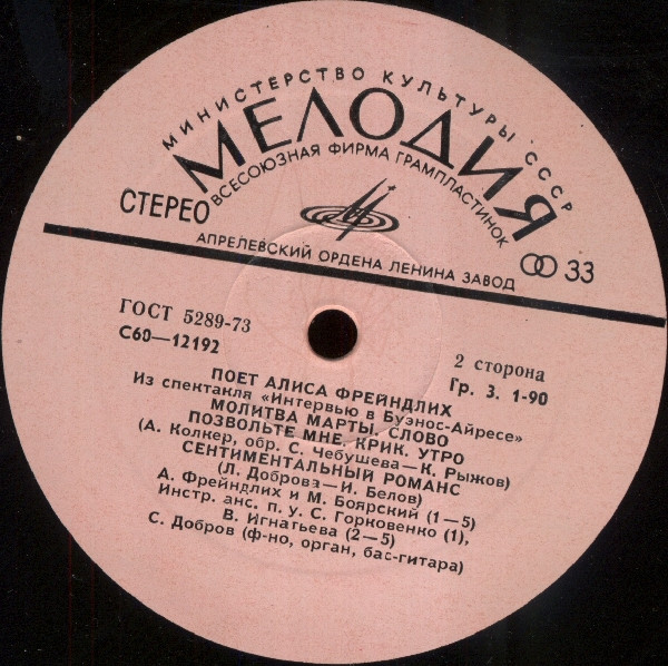 - Vocals – Алиса Фрейндлих, М. Боярский* (tracks: B1 to B5)