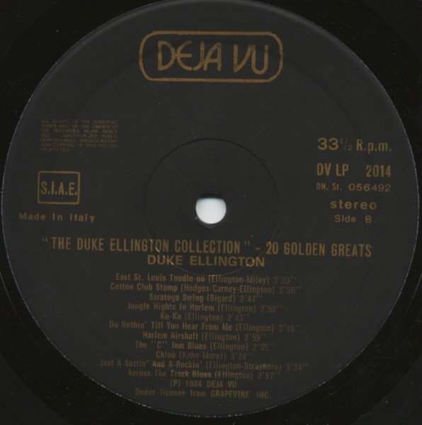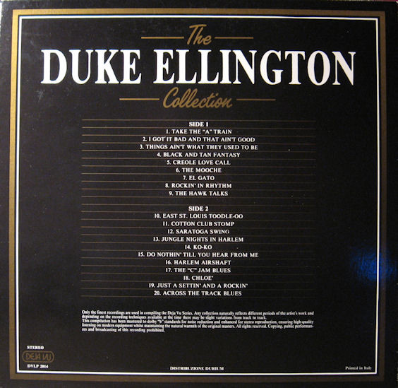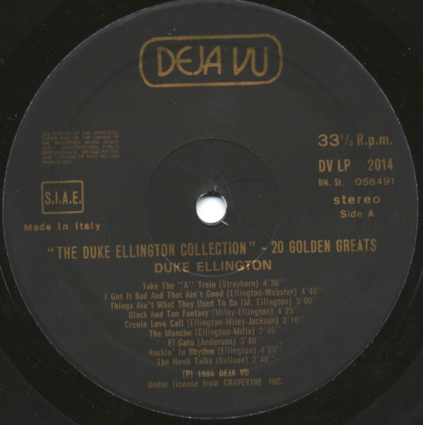 Labels are black with gold text. Similar version with white text & different Dejavu logo here Duke Ellington - The Duke Ellington Collection - 20 Golden Greats