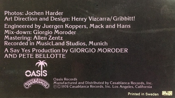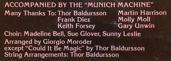 - Arranged By – Giorgio Moroder (tracks: A1, B1, B3, B4), Thor Baldursson (tracks: B2)