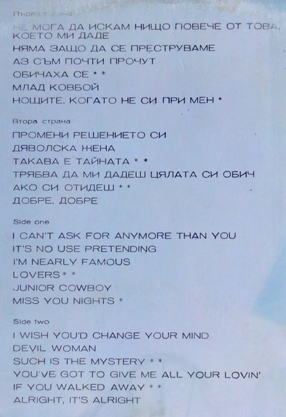 - Arranged By – Andrew Powel* (tracks: A6), Bruce Welch, Richard Hewson (tracks: A4, B3, B5)