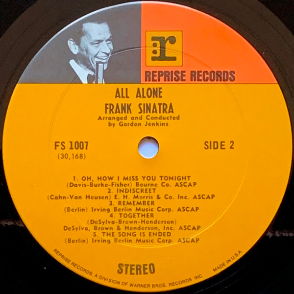 This style of label continued throughout the 1970s on Frank Sinatra releases with a changing bottom rim text, adding W lozenge [1974], changing Warner Bros Records, Inc to Warner Communications, Inc [1972]