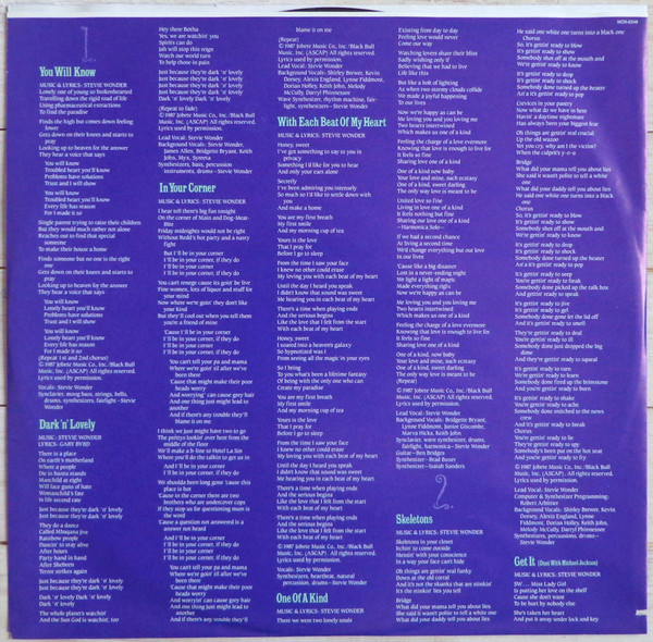 - Lead Vocals – Stevie Wonder (tracks: A2, A3, A5 to B5)