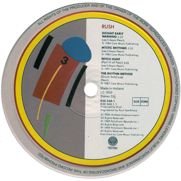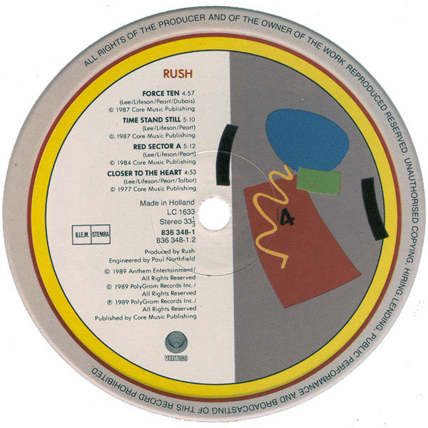 - Written-By – Lifeson* (tracks: A1 to C3, D1 to D4), Lee* (tracks: A1 to C3, D1 to D4), Peart*, Dubois* (tracks: D1)