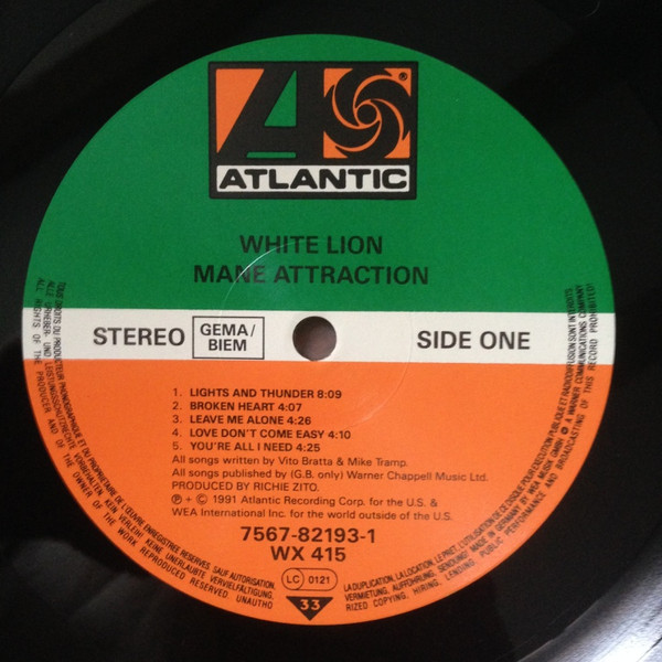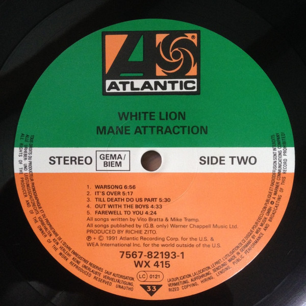 Similar european version without "All songs published by (G.B. only) Warner Chappell Music Ltd." on labels: White Lion - Mane Attraction.
