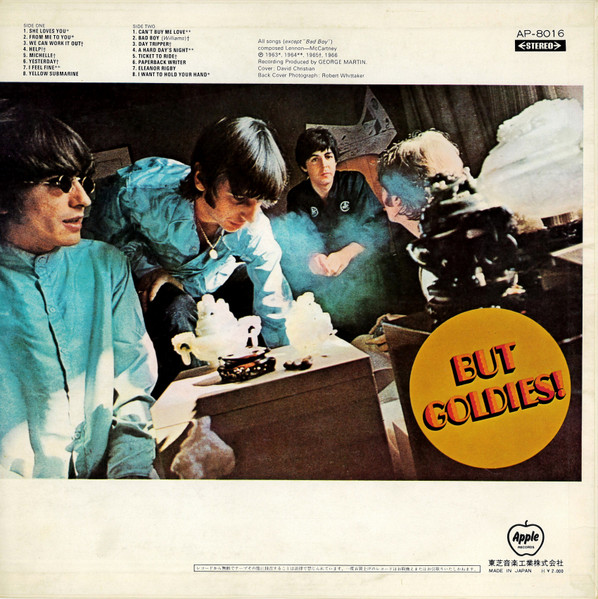 The photography of the back cover is reversed, Harrison is on the left side the circle with "but goldies" is on the right side.