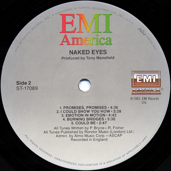 Centerlabel has typo in the credits "P. Bryne - R. Fisher" for songwriting. Sleeve is correct. (See Naked Eyes for one without the typo and with the shorter version of track B1)