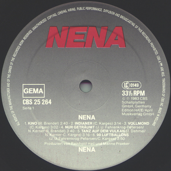 Very similar to Nena - Nena but without the asterisk above the label code on labels.