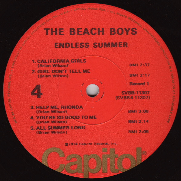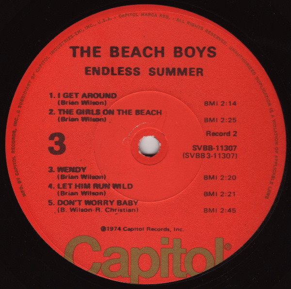 Gatefold sleeve, initial pressings include fold-out poster depicting an airplane flying a Beach Boys banner. Printed on poster - Aircraft: Boeing Stearman Biplane (1933-45) The Beach Boys Endless Summer © 1974 Capitol Records Printed in U.S.A. (SVBB-11307).