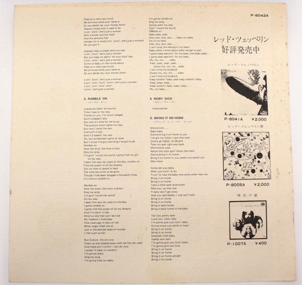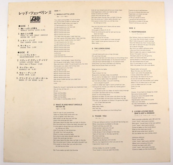 Comes in a gatefold sleeve with Rock Age obi with Atlantic/Warner Catalogue, lyric sheet with Led Zeppelin discography + inner sleeve with Atlantic/Warner Catalogue. item turn ¥ 2,000 on obi and back sleeve.