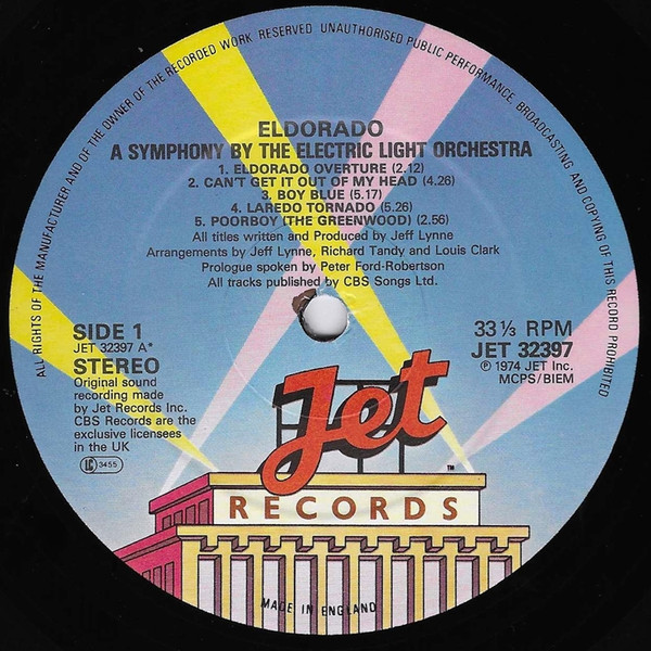 "Original sound recording made by Jet Records Inc. CBS Records are the exclusive licensees in the UK" printed on labels.