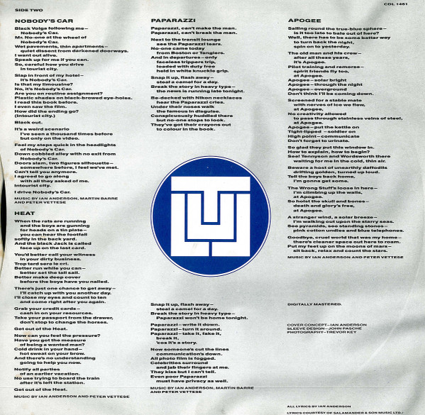 - Written-By – Ian Anderson (tracks: All), Martin Barre (tracks: A1; A4), Peter Vettese* (tracks: A1; A2; A4; B4; B5; B6)
