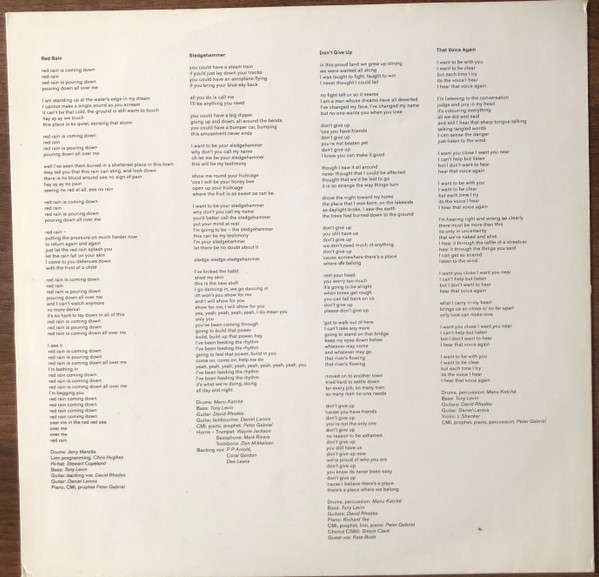 Synthesizer [CMI, Prophet], Piano, Percussion – Peter Gabriel