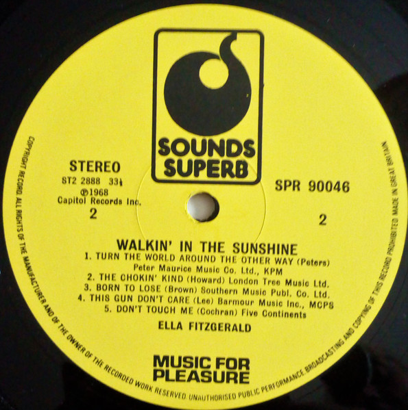 Variant to Ella Fitzgerald - Walkin' In The Sunshine due to absence of text directly above the EMI logo at bottom of back cover.