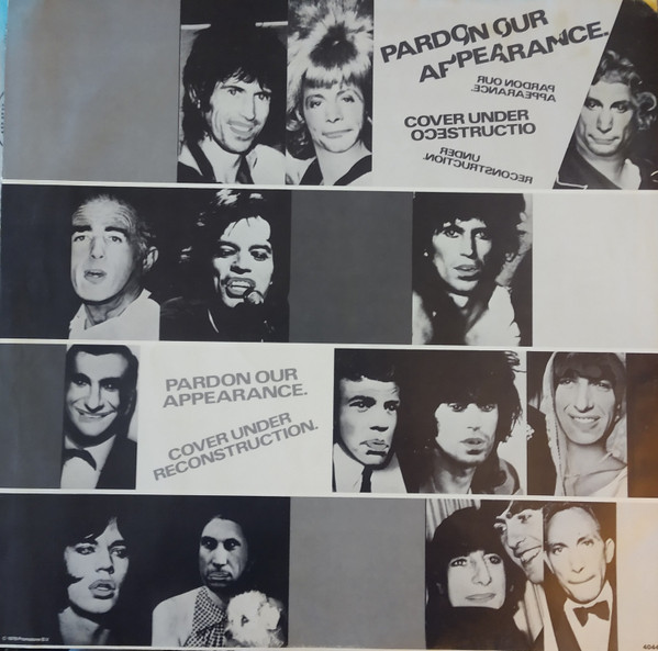 Inner sleeve has a mix of black & white photos of Stones in wigs and out of wig, with the words "Pardon our appearance. Cover under reconstruction."