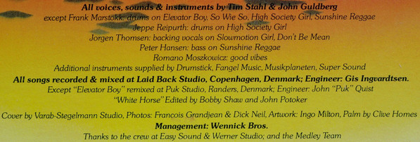 All songs recorded & mixed at Laid Back Studio, Copenhagen, Denmark. Except [A2] remixed at Puk Studio, Randers, Denmark.