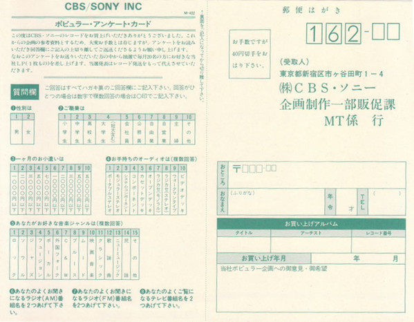 Manufactured by CBS/Sony Inc., Tokyo, Japan