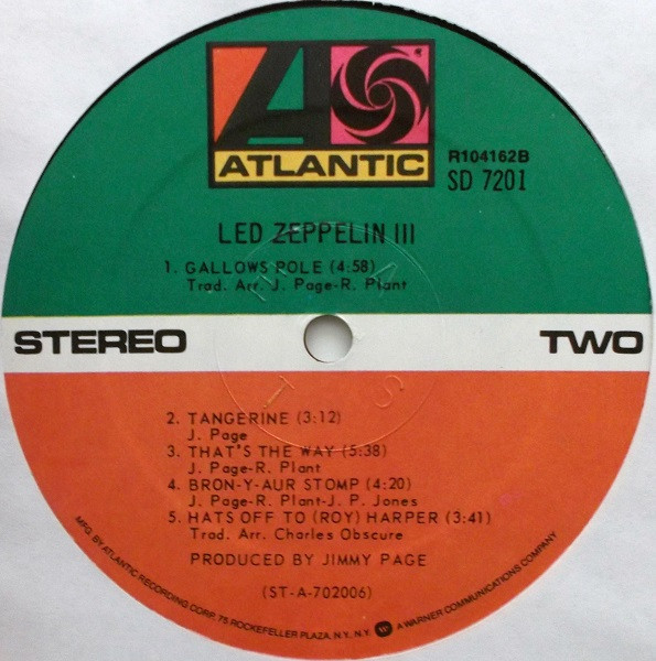 Reissue pressing of Led Zeppelin - Led Zeppelin III that shows the 75 Rockerfeller Plaza Address and Warner Communications logo.
