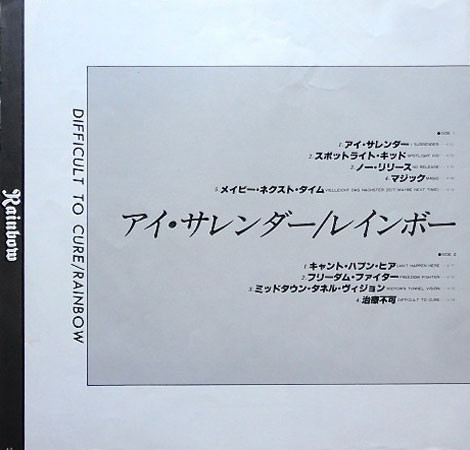 This is the March 1981 initial 1st release that comes with an obi that features the "Polydor Heavy Metal Campaign" enquête(questionnaire/survey) form on the backside that you could cut out and mail in before the end of April for a chance to be one of the 5000 lucky winners of a Rainbow "Metal" Sticker. Also comes with a 4 page insert with liner notes by Masa Itoh. The outer pages are parallel to the inner sleeve bags of foreign releases(medical equipment photos and lyrics).