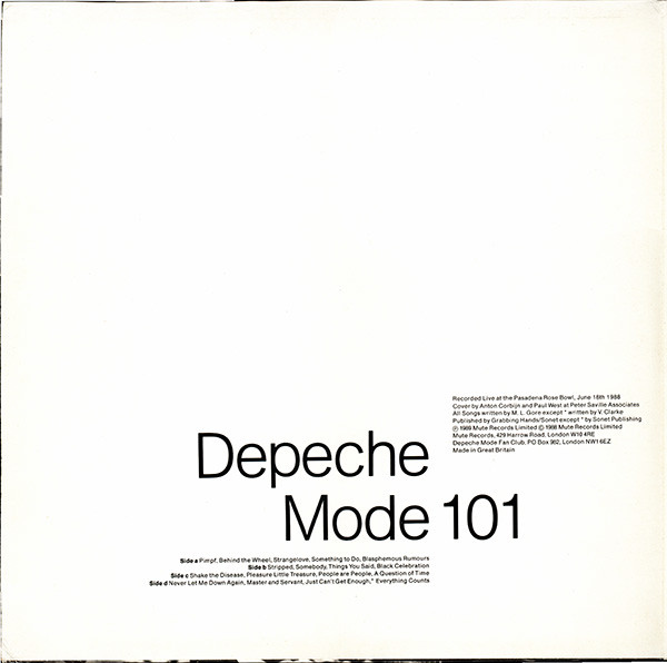 "Depeche Mode 101" is not printed on the front of the outer cover. In fact this is a sticker. It is positioned just below the top, middle. As it has been applied manually, its precise position from copy to copy varies fractionally in this respect.