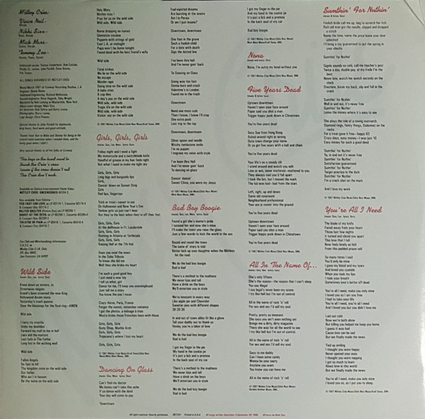 Tracks A5, B1 and B3 © 1987 Mötley Crüe Music/Sikki Nixx Music, BMI.