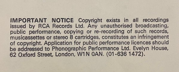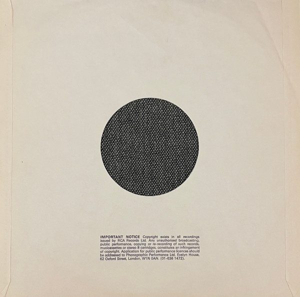 - Pressed By – RCA Records Pressing Plant, Washington, UK