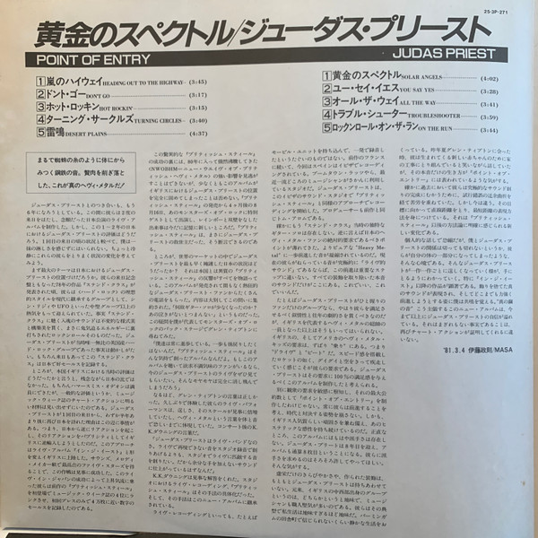 Back side of obi shows 5 previous Judas Priest releases on Epic.