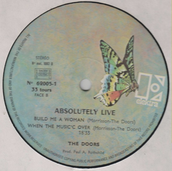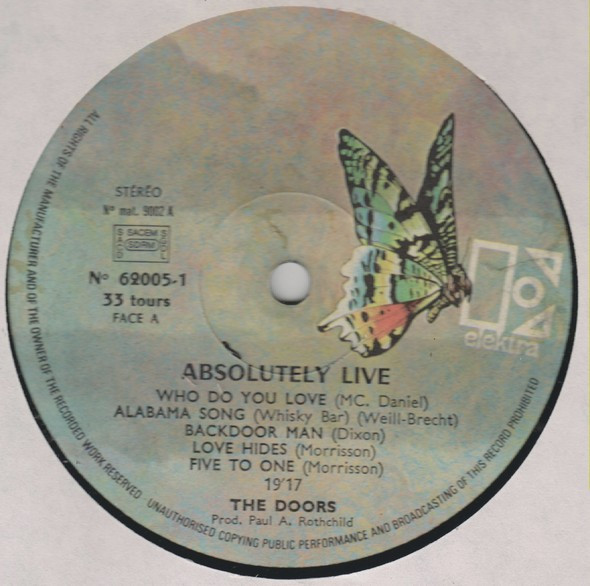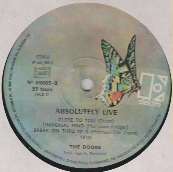 Longer matrix and different distributor (bottom left back sleeve) than The Doors - Absolutely Live