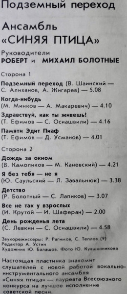 - Engineer – Р. Рагимов* (tracks: A1 to B4), С. Теплов* (tracks: B5)