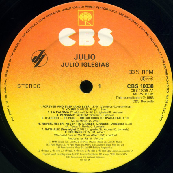| A1 | Julio Iglesias– | Forever And Ever (And Ever) | 3:40 |