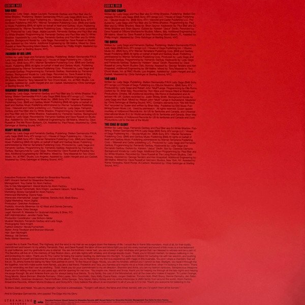 Track A1 - Publishing: Stefani Germanotta P/K/A Lady Gaga (BMI) Sony ATV songs LLC / House Of Gaga Publishing Inc. / GloJoe Music Inc. (BMI) Sony ATV / Warner-Tamerlane Publishing Corp. (BMI) and Garibay Music Publishing (BMI). All rights on behalf of itself and Garibay Music Publishing administered by Warner-Tamerlane Publishing Corp. Recorded on Studio Bus. Mixed by Tony Maserati for Two Chord Music, Inc. at RMC Studio, Los Angeles. Mastered at Sterling Sound, NYC.