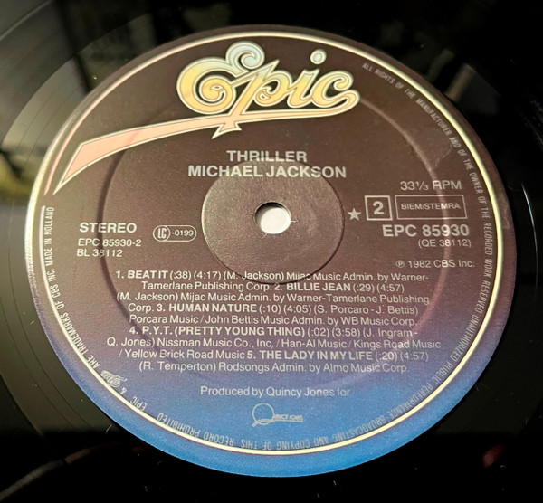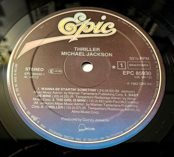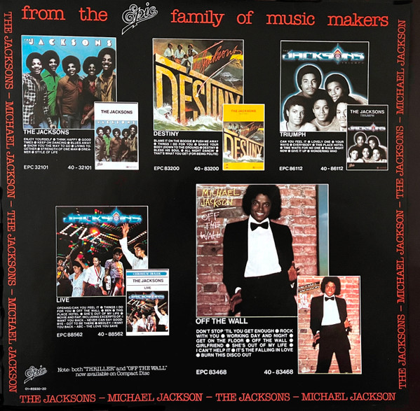 Issued with a front cover medium sticker (red on black) stating "WORLD'S BEST SELLING ALBUM contains 7 HIT SINGLES" and a one sided colour insert with promotional information about Michael Jackson's and The Jacksons' previous albums released on Epic.