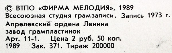 Всесоюзная студия грамзаписи. Запись 1973 г.