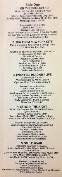 Spies In The NightArranged By [Rhythm & Vocals] – Jay GraydonArranged By [Vocals] – Alan PaulBass – Abraham LaborielDrums – Steve GaddElectric Guitar – Jay GraydonLyrics By – Alan PaulMusic By – Alan Paul, David Foster, Jay GraydonPiano – David FosterRhythm Guitar – Steve LukatherSynthesizer – Mike Boddicker* |