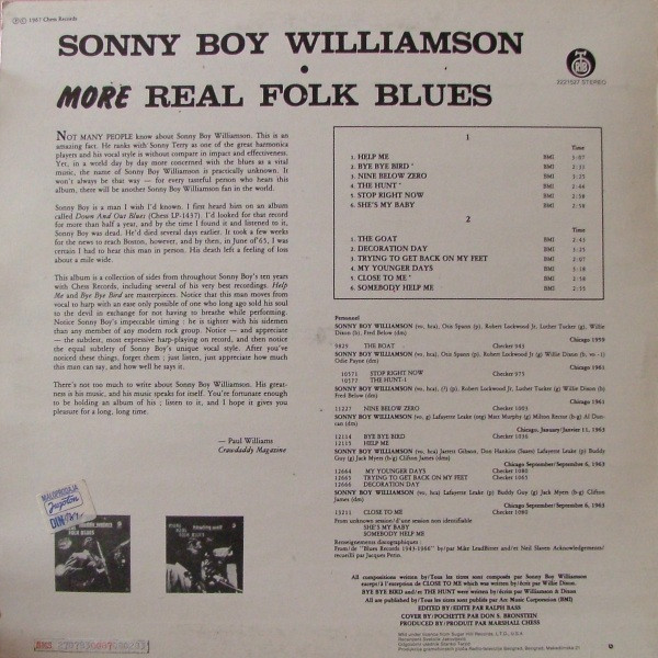 - Vocals – Sonny Boy Williamson (2)