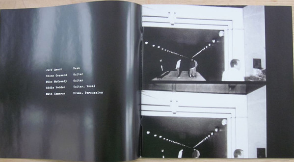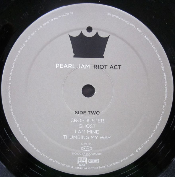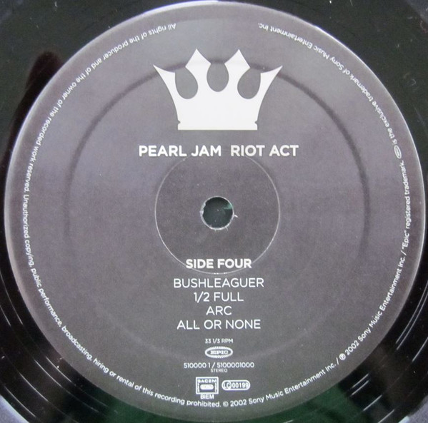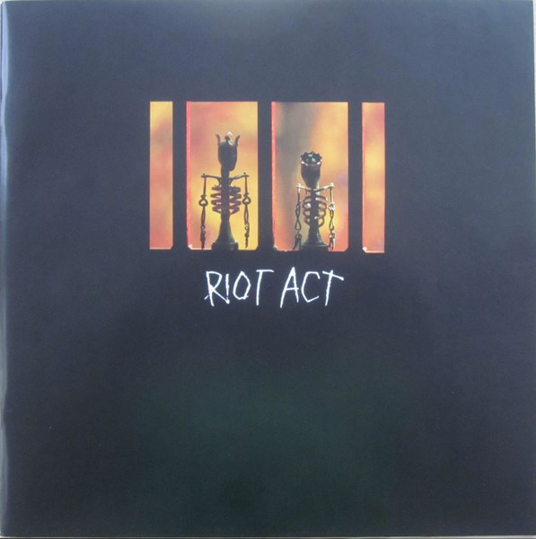 Comes with a colored booklet containing lyrics, photos and credits in a gatefold sleeve with a wide spine and a black rectangular sticker attached to the upper right of the front sleeve - reading 'PEARL JAM' (in white lettering) & 'RIOT ACT' (in dark green lettering).