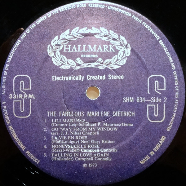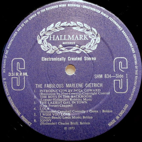 Made in England. All tracks are mastered in simulated stereo. On labels and back cover: "Electronically Created Stereo".