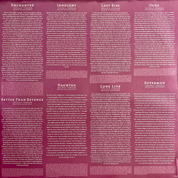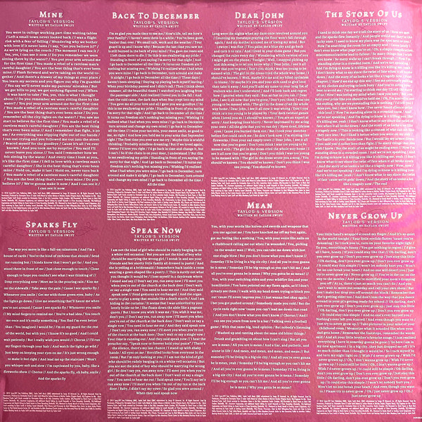 B8: © 2010 Sony/ATV Tree Publishing (BMI), Taylor Swift Music (BMI) administered by Songs Of Universal, Inc. Mixed... at MixStar Studios (Virginia Beach, VA) / Taylor Swift vocals recorded... at the Kitty Committee Studio (London, UK) / Recorded... at Black Bird Studios {Nashville, TN) / Assistant engineering and additional digital editing... at Prime Recording (Nashville, TN) / Additional engineering and digital editing... at Prime Recording (Nashville, TN) / Mastered... at Sterling Sound (Edgewater, NJ) / Vinyl mastering... at Sterling Sound (Nashville, TN)