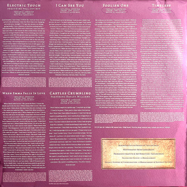 E17: © 2010 Sony/ATV Tree Publishing (BMI), Taylor Swift Music (BMI) administered by Songs Of Universal, Inc. / Mixed... at Long Pond (Hudson Valley, NY) / Engineered... at Long Pond (Hudson Valley, NY) and The Clubhouse (Rhinebeck, NY) / Additional recording by Bella Blasko at Long Pond (Hudson Valley, NY), Thomas Bartlett at The Dwelling (New York, NY), Benjamin Lanz (Paris, FR), James McAlister (Los Angeles, CA) and Patrick Stump at Nevous Breakdown (Los Angeles, CA) / Taylor Swift vocals recorded... at the Kitty Committee Studio (London, UK) / Patrick Stump vocals recorded... at Nevous Breakdown (Los Angeles, CA) / Mastered... at Sterling Sound (Edgewater, NJ) / Vinyl mastering... at Sterling Sound (Nashville, TN)