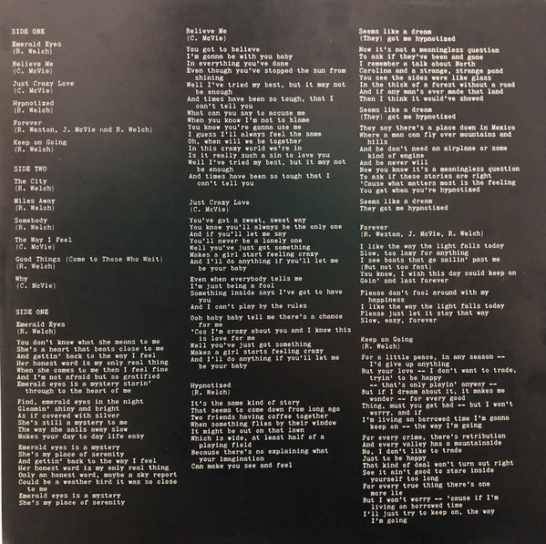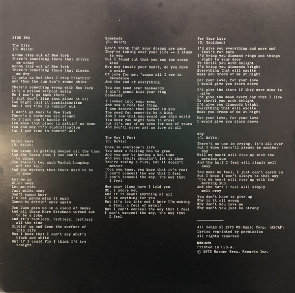 Included on the lyric cut sheet is a track that does not appear on the album. "Good Things (Come To Those Who Wait)" credited to R. Welch. This song was replaced by "For Your Love" on the album.