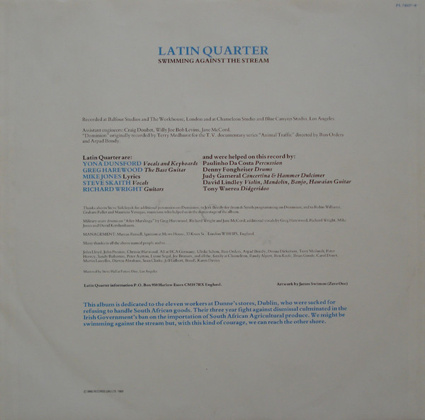 This album is dedicated to the eleven workers at Dunne's stores, Dublin, who were sacked for refusing to handle South Africa goods. Their three year fight against dismissal culminated in the Irish Government's ban on the importation of South Africa Agricultural produce. We might be Swimming Against The Stream but, with this kind of courage, we can reach the other shore.