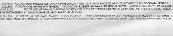 Recorded at Bray & Chipping Norton Studios, December 1984
